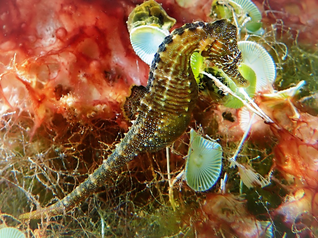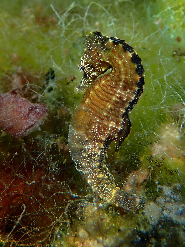 This proud papa, a lined seahorse, flaunts his pregnancy with a swollen brood pouch and will soon give live birth to hundreds of baby seahorses. Photograph: © Jeffrey Cardenas