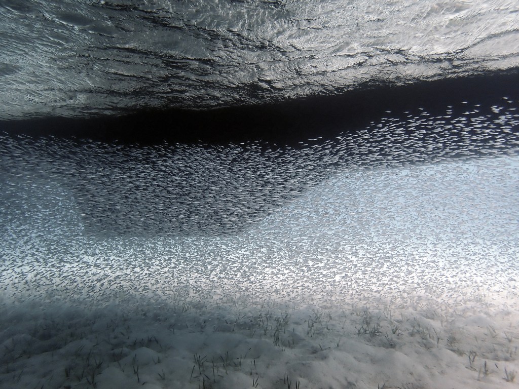 As I worked underwater, a sphere of translucent glass minnows surrounded me in a sanctuary they found under the boat. Glass minnows are shape shifters. En masse, they form a defensive cocoon; a cloud of life that changes its appearance like smoke. It’s a fish version of starlings moving together in an underwater murmuration.